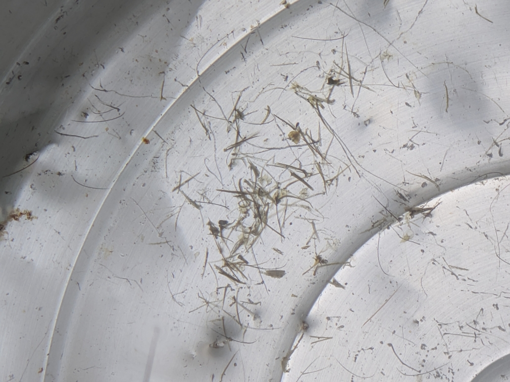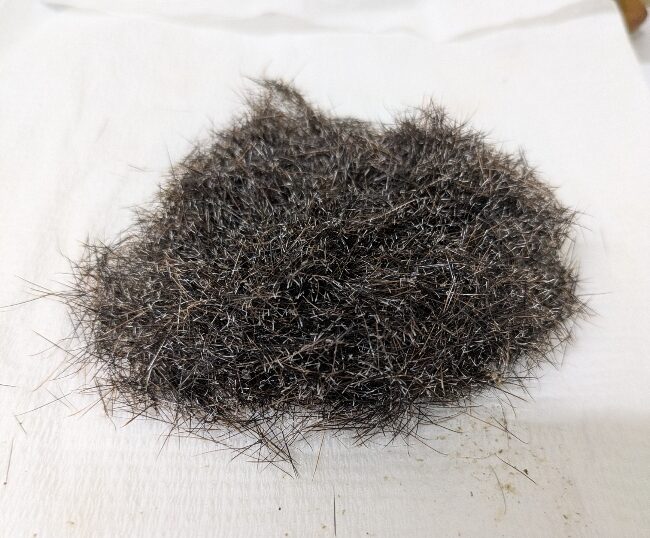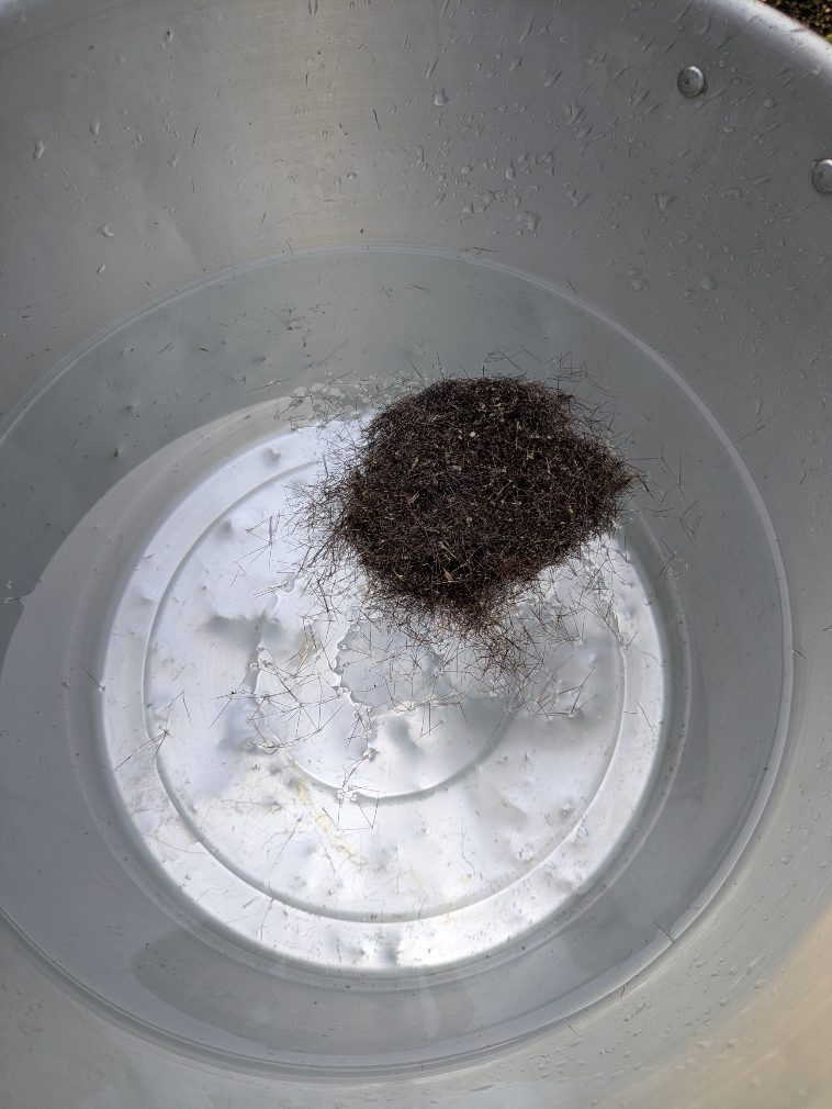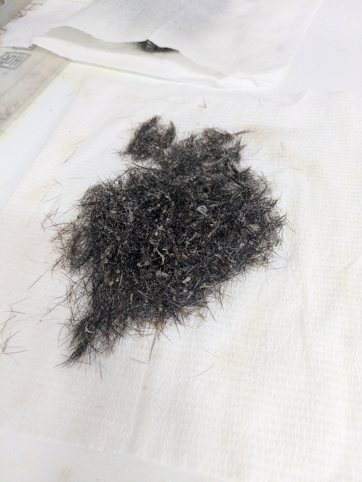 かき混ぜては水中を舞う毛を網ですくうことを繰り返すこと十数回、概ねゴミと毛を選別することができました