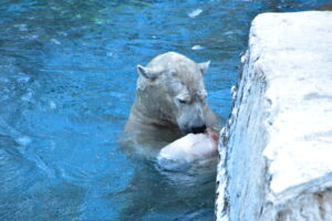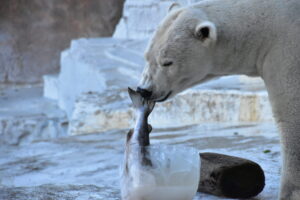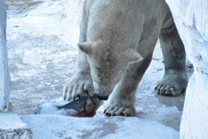 エンリッチメントとは、動物たちの生活を豊かにするための工夫のことです。おやつのあげ方を工夫したり、その動物の特性に合わせた施設にしたり、嗅覚を刺激するように違う動物の匂いがついたものをあげたりすることです。今回、サケを凍らせているのもその一環です。解凍されたサケだけだと一瞬で終わってしまうので、長く楽しんでもらうことが目的です。