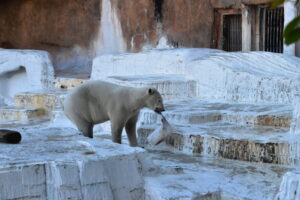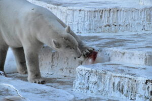 11月22日(土曜日)に、ホッキョクグマの「ホウちゃん」5歳の誕生日(11月25日)を記念して、「ホッキョクグマ誕生日イベント」を実施しました。今年も株式会社蓬莱様より、約72cm、約3.2kgという、立派なサケのプレゼントをいただき、当日ホウちゃんにプレゼントしました。