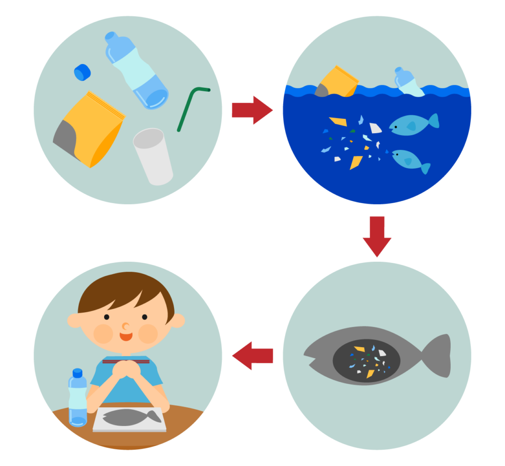 風や川で流れていった我々のプラスチックが海で細かくなり、細かくなったプラスチックを魚など海洋生物が食べ、それを人間が食べてしまうということが起きています。