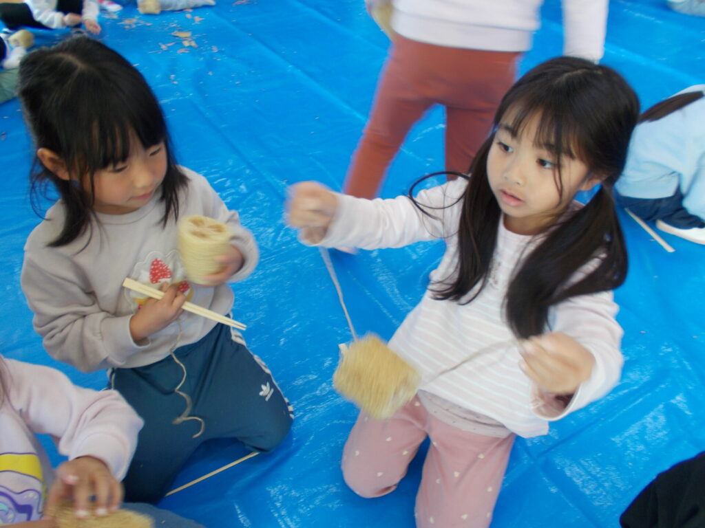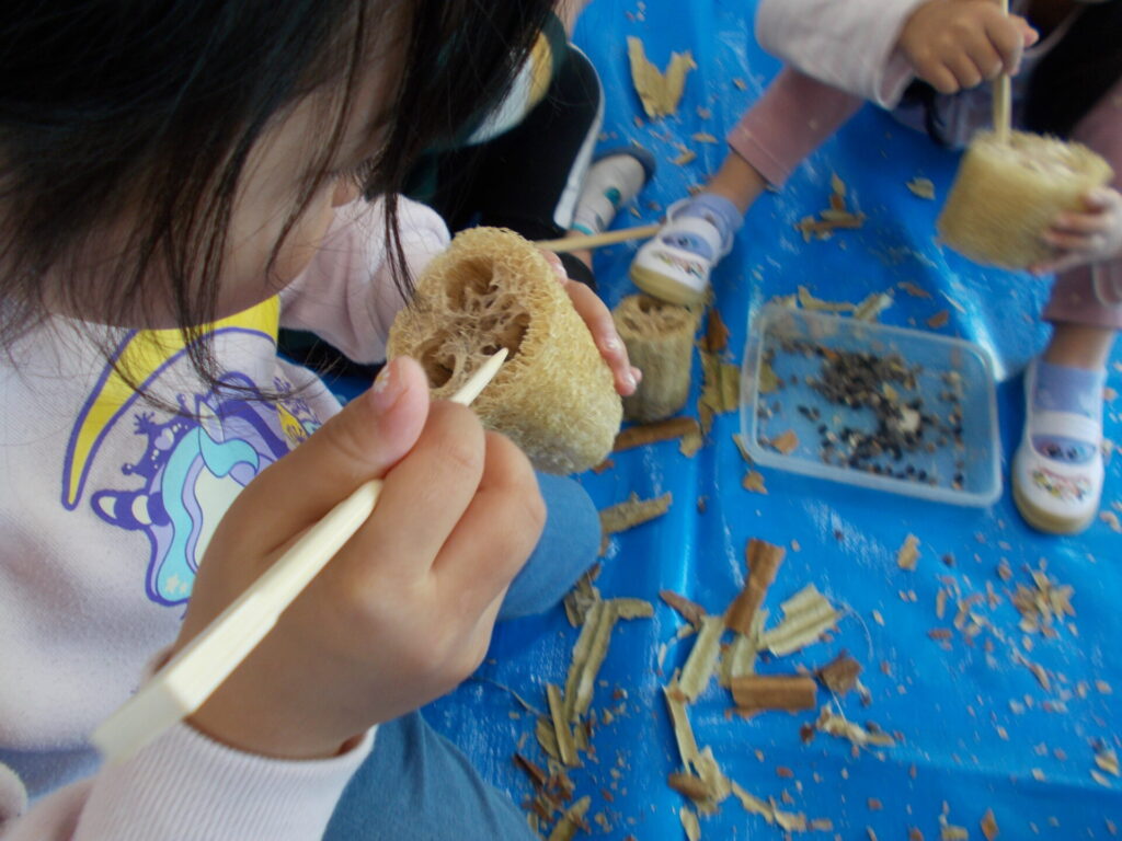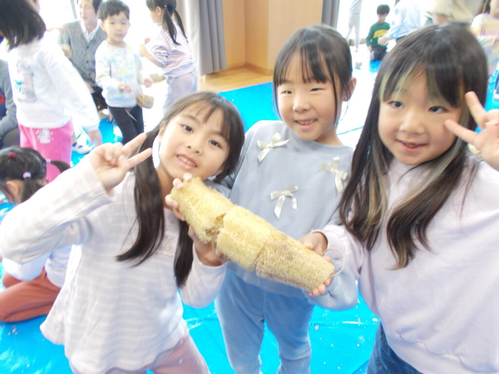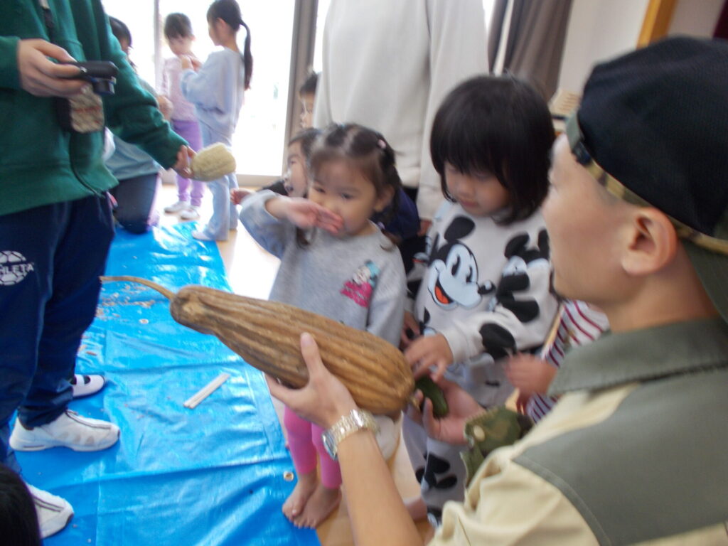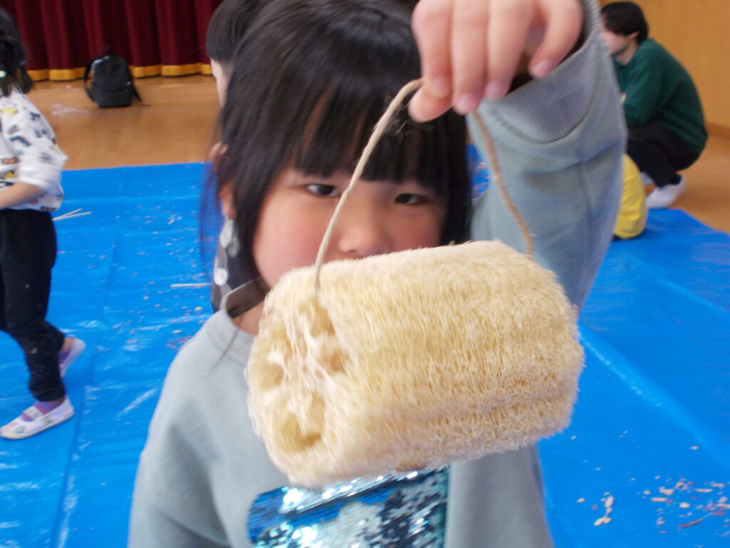 無事に実ったヘチマを収穫し、ともしび保育園の園児たちとヘチマたわし作りもしました⇩