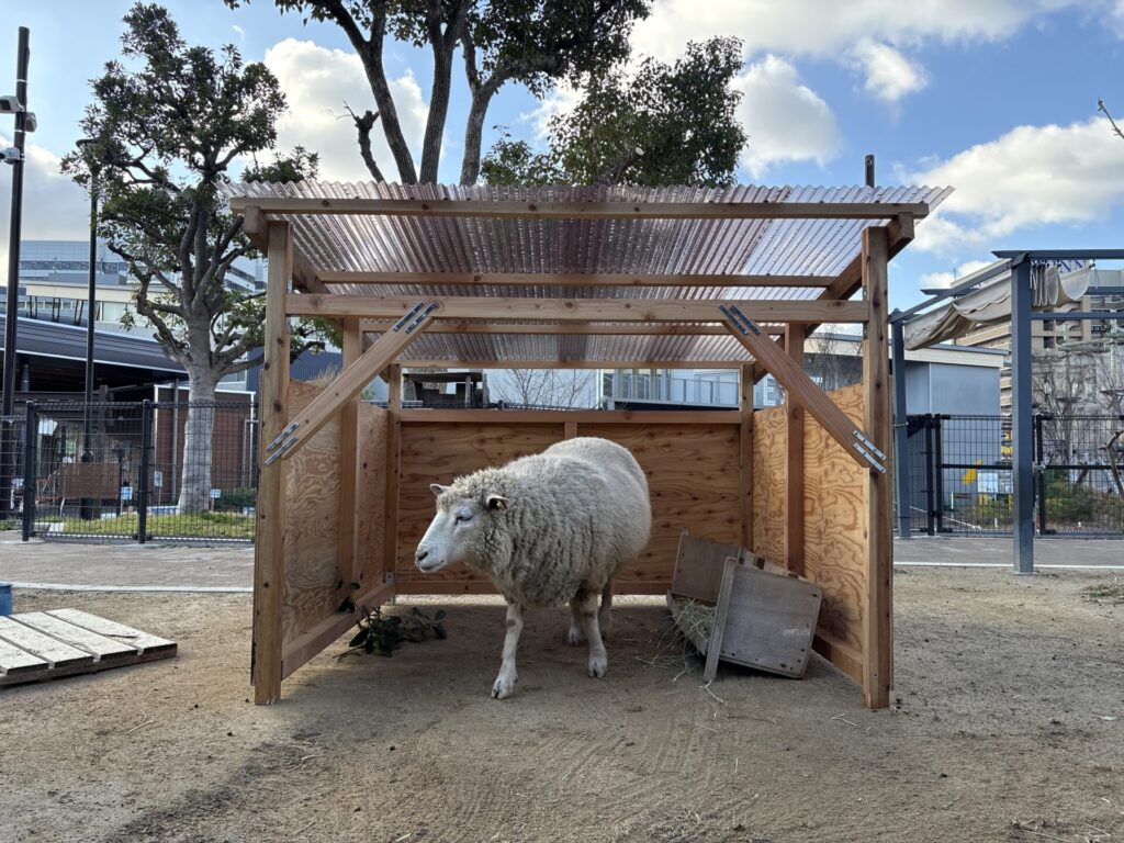 若ヒツジのフラッペ、ラッシー、チャイは夜も広い環境で過ごせるように、また、運動目的もかねて夜間も屋外展示場で暮らしています。