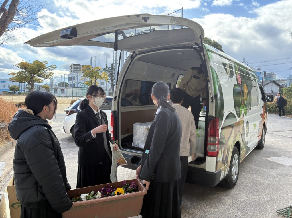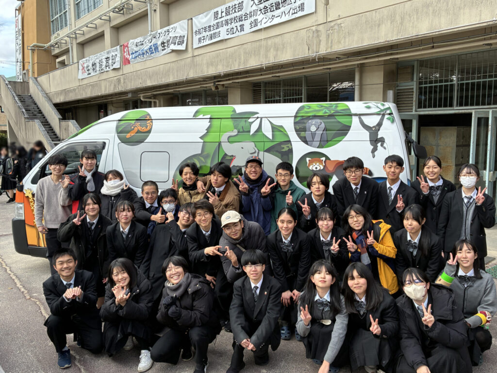 大阪府立枚方高校に現れた天王寺動物園の派手な車。ここに資材や生き物たちを積載します。
