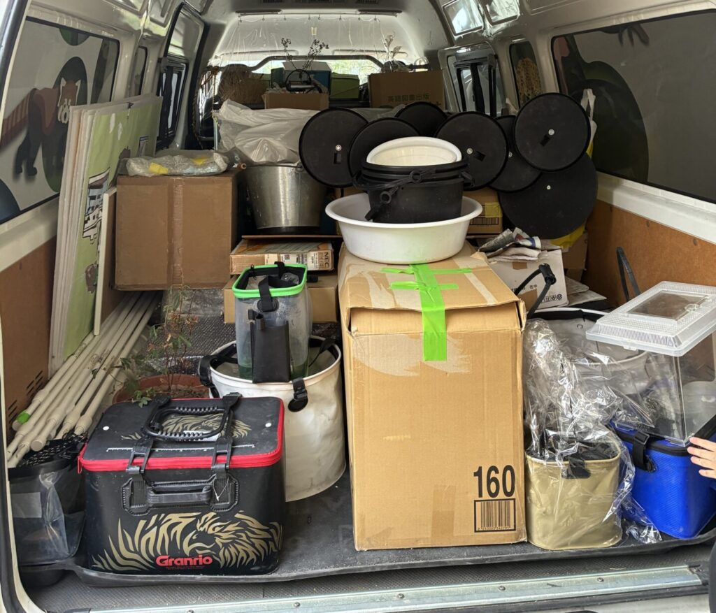 あまりにもの物量に入りきらないかと不安がよぎりましたが、みんなでパズルを解くように工夫して、何とか入りきりました。
