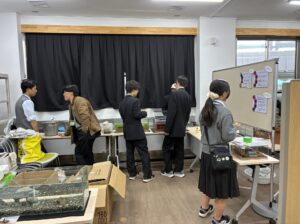 動物園に到着したらみんなで設営開始。部員のみなさまは色んな所でイベントの開催経験があり、手際よく設営を進めます。飼育技術や生き物の扱い方だけでなく、展示の内容やセンスもすばらしいと感心しました。