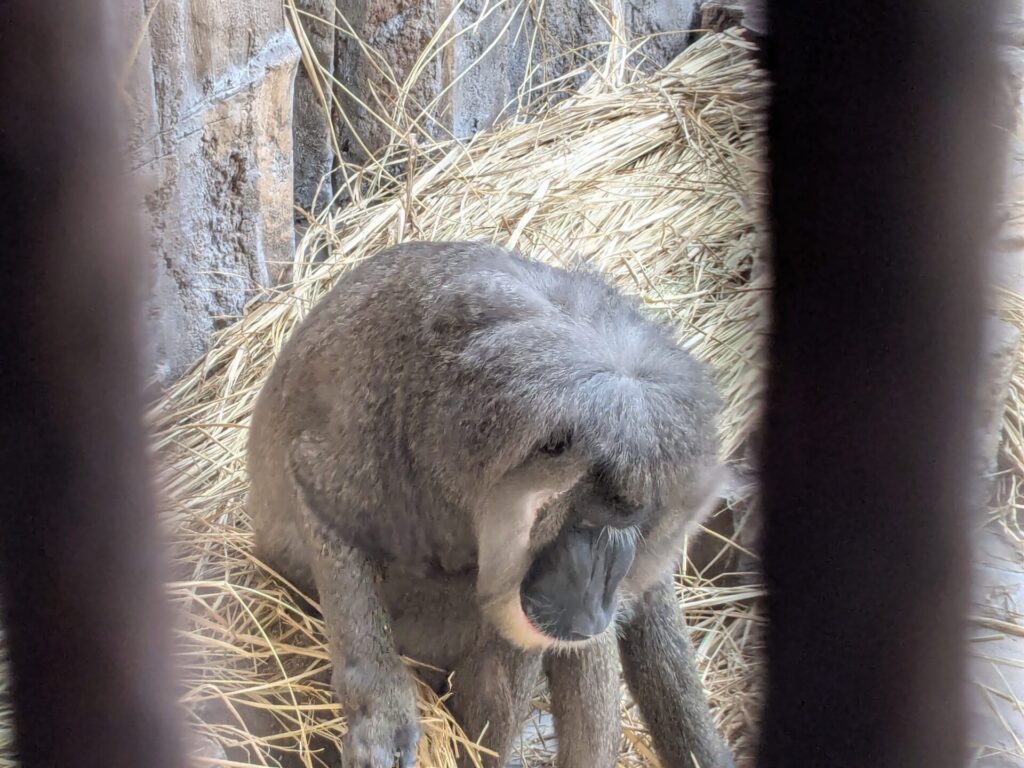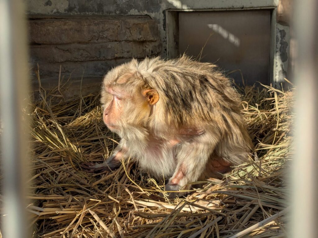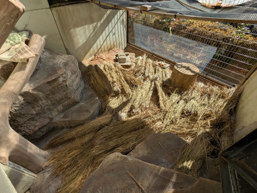 ブタオザルのキキの放飼場にもいただいた稲わらをたくさん敷いて床が寒くないようにしました。