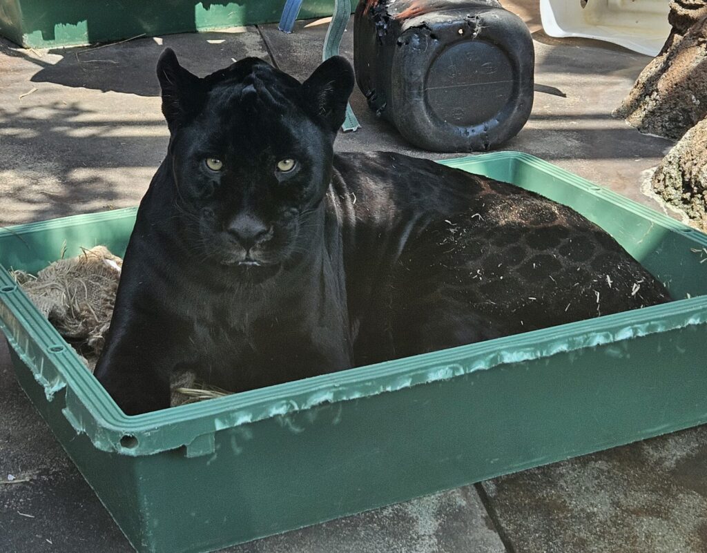 一方、小春は生まれが静岡ですが、元々当園で暮らしていたジャガーの子孫にあたります。体色は黒変種と言って、黒い体をしています。真っ黒といえどもその中でもしっかりとジャガー柄が見えます。特に太陽の光が当たるととてもハッキリ見えて美しいですよ!!