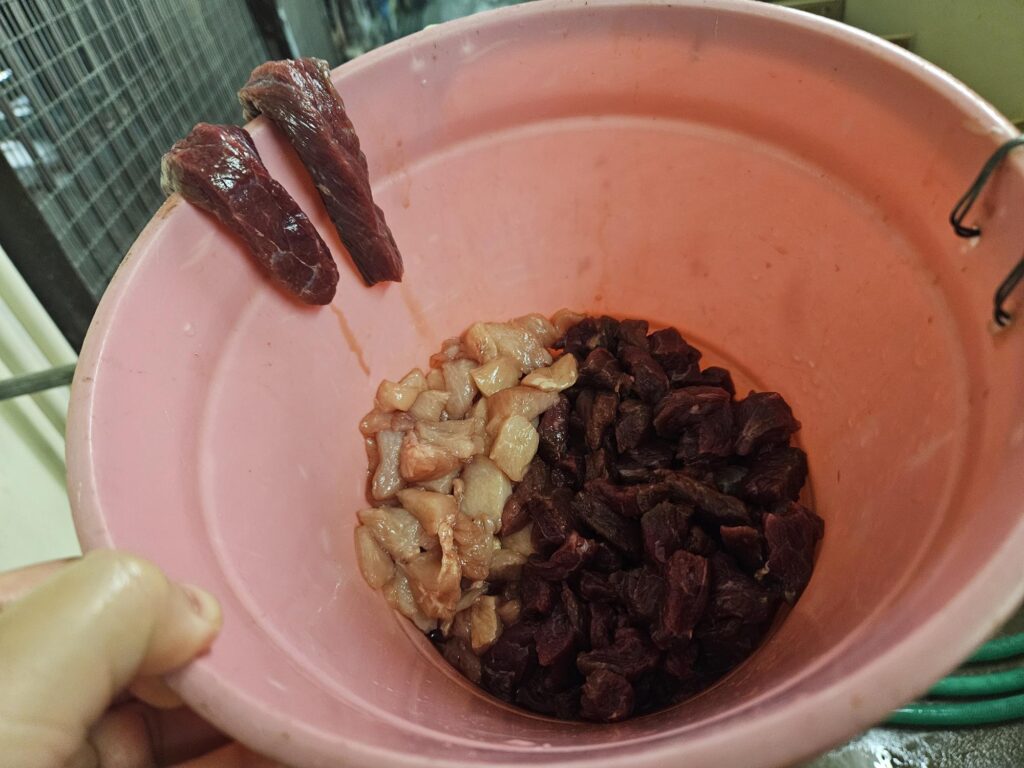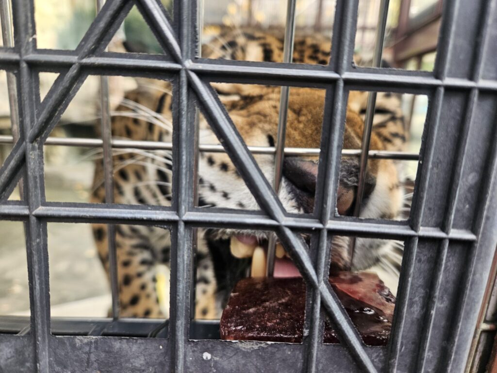 ロンは、担当が私に代わってすぐはとても警戒していました。もちろん知らない人がいきなり呼んでも来るはずもなく、「シャー」と警戒させてしまうところからのスタートでした。そのため、ロンに会うときは常にロンの好きなお肉を、私に近づくと与えるところからスタートしました。数日のうちに慣れてくれて、差し出したお肉をテロっと優しくなめ取ってくれるようになりました。2頭ともに共通するトレーニングの目標としては、『だれでもできる』『次の担当に引き継げる』を掲げました。ということで、トレーニングの第1段階は、「私の前に来る」ができたら、「いいね」の合図のホイッスルを「ピッ」と鳴らして、同時にご褒美のお肉を与えるところから始めました。