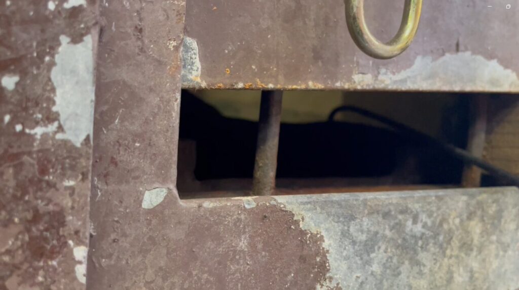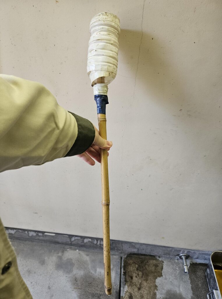 ⇩小窓からフックを入れて尾を手繰り寄せる様子