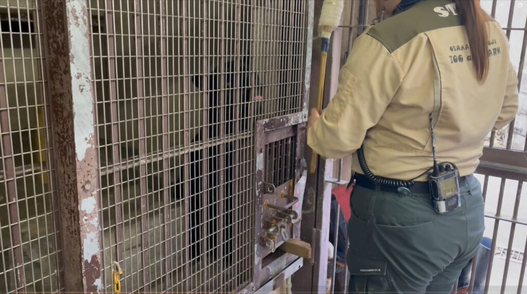 トレーニングの際は皆様から見えないところに2頭が行ってしまうので、少しの間お待ちいただくことにはなりますが、このようなことをしているということでした。トレーニングが終わると2頭には展示場で大ご褒美を与えます。お肉のお汁を凍らせた特製アイスです。このとき、楽しみにしているのか2頭とも一目散に来てくれます!彼らがアイスをぺろぺろしている間は、皆様にもゆっくり近くで観察してもらえる時間になると思っています。