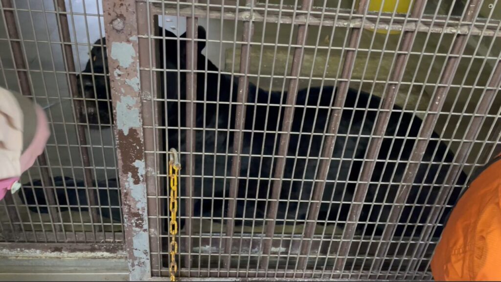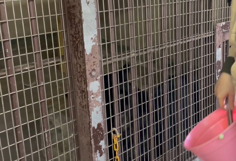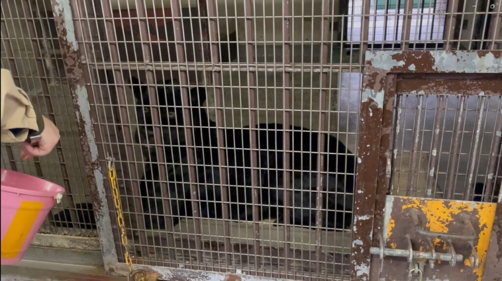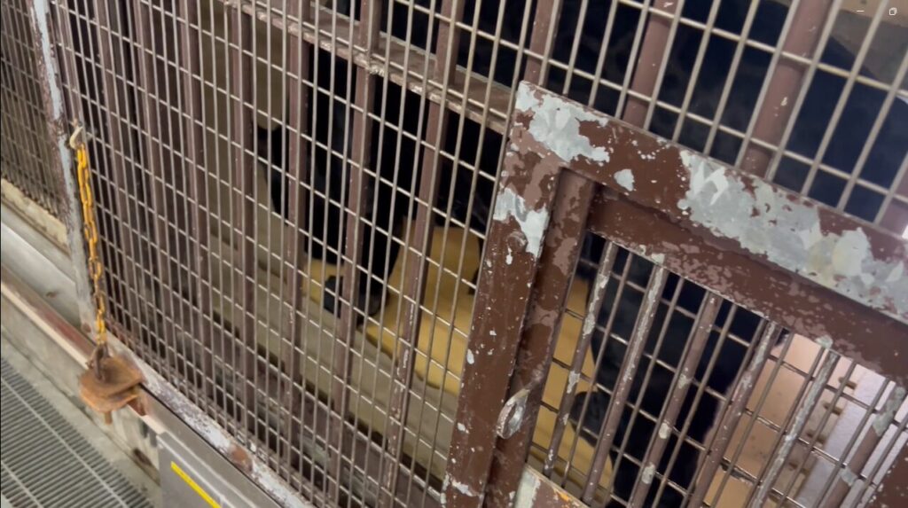 採血のトレーニングでは、尾から採血をするため、寝室の柵にある小窓から尾を出せるように、その場所で伏せの姿勢をしてもらうようにしました。柵に体を寄せてもらわないと尾が出ないため、前任者から受け継がれた特製の台を置いて、柵と並行になるような姿勢をとってもらいました。ロンは前任者とトレーニングをしていたこともあり、ここまではスムーズにできるようになりました。