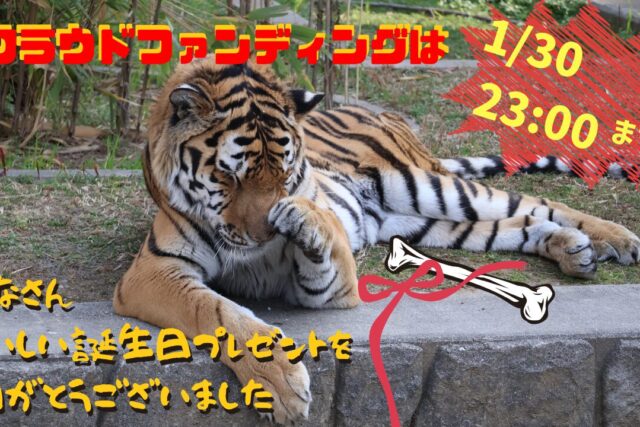 飼育員ブログHAPPY BIRTHDAY 今日はショウヘイの誕生日🥳 2026.01.29アムールトラクラウドファンディングショウヘイショウヘイのおもちゃ箱寄附誕生日飼育員ブログ 1月29日の本日は、アムールトラ・ショウヘイの🎉誕生日🎉 クラウドファンディング『アムールトラ「ショウヘイ」に、みんなでつくるおもちゃ箱をプレゼント』で『ショウヘイのバースデイプレゼント!』にご支援いただいた方は、大きな骨付き...