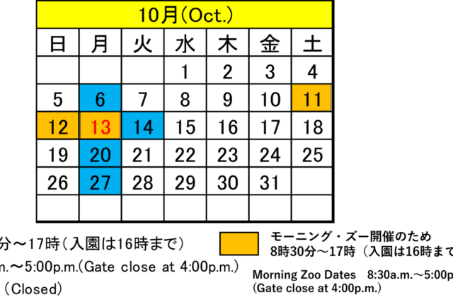 お知らせ10月の営業日について🍂 2025.09.29お知らせ いつも天王寺動物園にお越しいただき、ありがとうございます。 10月の休園日は 6日(月曜日) 14日(火曜日) 20日(月曜日) 27日(月曜日)です。 10月11日(土曜日)~13日(月曜日・祝日)は秋のモーニング・ズ...
