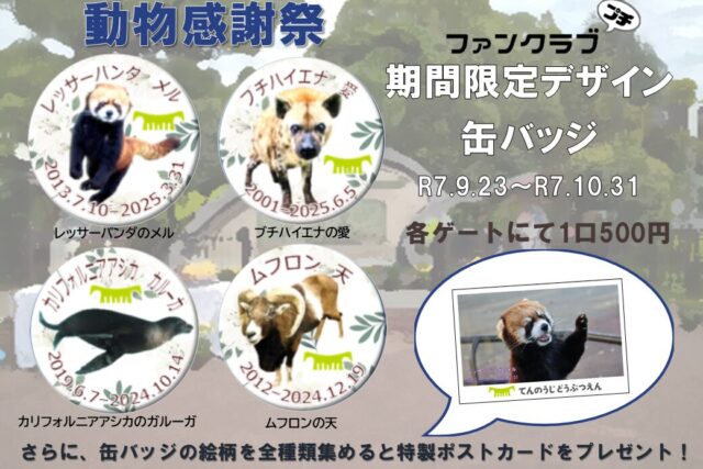 お知らせファンクラブプチ 秋の「TenZooまつり」10~12月の缶バッジはこちら! 2025.09.30お知らせ 10月1日(水曜日)~12月28日(日曜日)までファンクラブプチ 秋の「TenZooまつり」として、オリジナル缶バッジが登場!! ファンクラブプチとは、ファンクラブに加入しなくてもできる、1口1コイン(500円)の応援です。 詳しくはこ...
