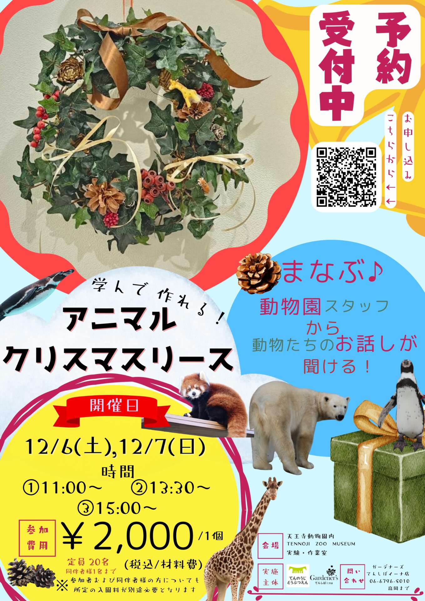内容:ガーデナーズてんしばイーナ店とともに、ワークショップ「学んで作れる!アニマルクリスマスリース」を開催します。ワークショップでは、クリスマスリースの材料として使用する動物達について動物園スタッフがお話し、動物について学んでいただいた後、クリスマスリースを作っていただきます。動物について学ぶこともでき、世界に1つだけのクリスマスリースが作れますので、是非ご参加ください。