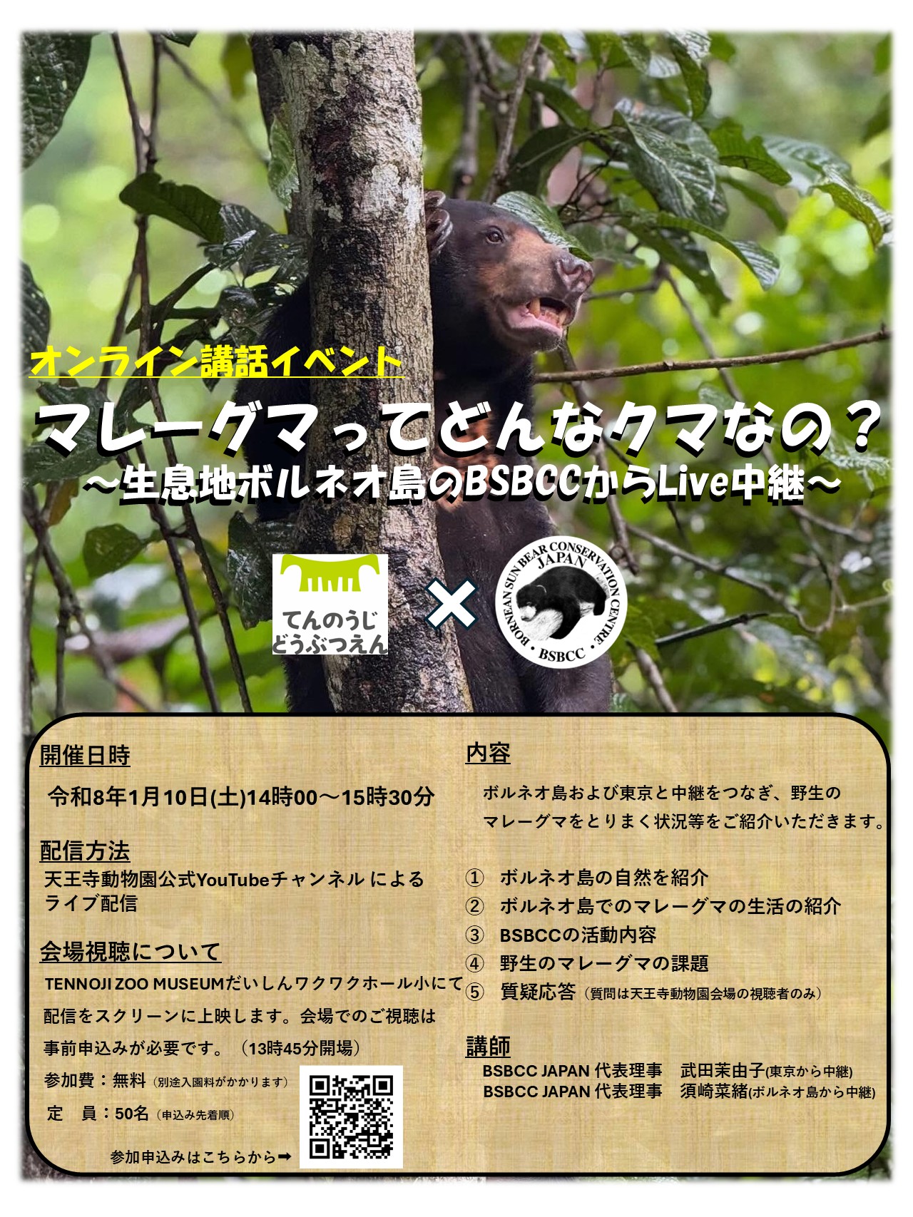 オンライン講演会「マレーグマってどんなクマなの?〜生息地ボルネオ島の BSBCC からLive 中継〜」の詳細はこちらです