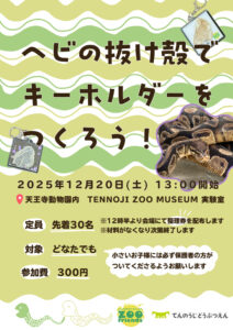 内容:動物園で飼育している「ボールパイソン」の抜け殻を使い、オリジナルのキーホルダーを作っていただきます。