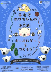 内容:天王寺動物園で飼育している羊たちの毛刈りした羊毛を使用し、ホッキョクグマの「ホウちゃん」のお顔キーホルダーを作っていただきます。