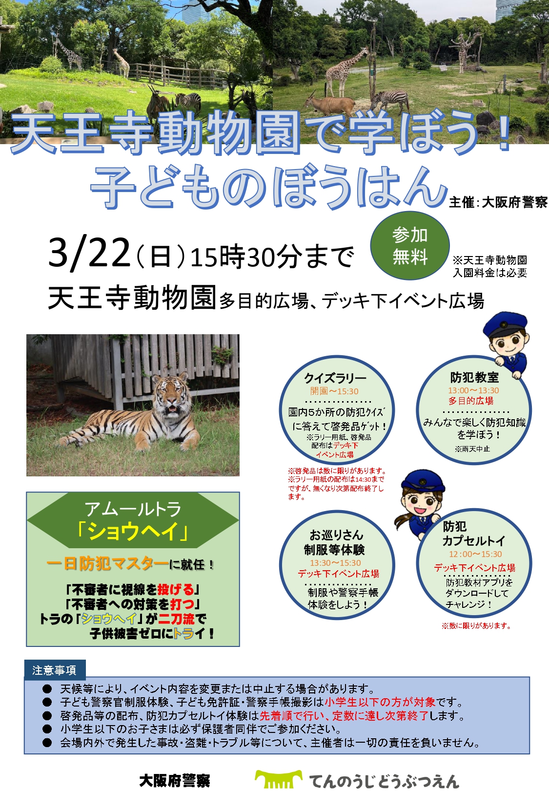 天王寺動物園では、大阪府警察等と連携し、「天王寺動物園で学ぼう!子どものぼうはん」を開催します。