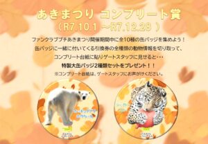 あきまつり開催期間中に、全10種の缶バッジに付いてくる引換券の動物情報を切り取って、コンプリート台紙に貼ってゲートスタッフに見せると・・・