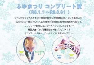 ふゆまつり開催期間中に、全10種の缶バッジに付いてくる引換券の動物情報を切り取って、コンプリート台紙に貼ってゲートスタッフに見せると・・・