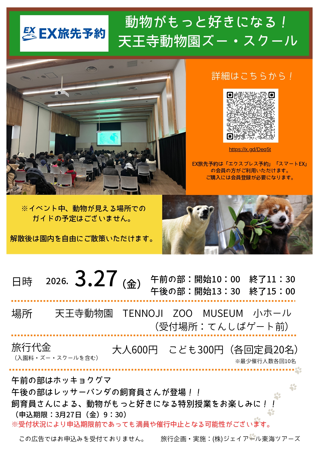 天王寺動物園では、JR東海ツアーズと「動物がもっと好きになる!天王寺動物園ズー・スクール」を開催予定です。