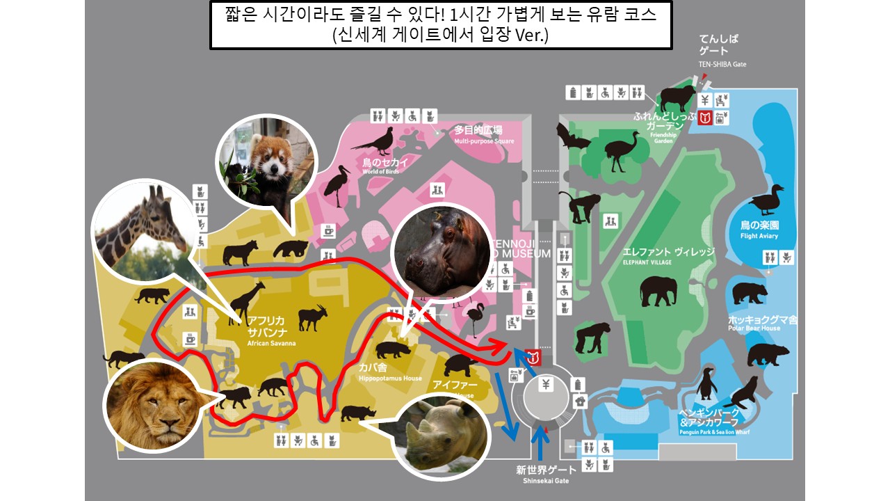 사자, 기린과 같은 큰 동물을 빠짐없이 확인하세요! 물속 풀에 있는 하마나 캘리포니아 바다사자를 가까이서 보실 수 있는 등 시간이 있는 분을 위한 대만족하실 수 있는 코스입니다.