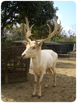 元々は南ヨーロッパから小アジアに分布していましたが、かなり以前に人為的にヨーロッパに移入され、半野生の状態で飼われています。その過程で体の鹿の子模様も消えました。日本のシカと違い、手のひらのように広がった立派な角が特徴です。
