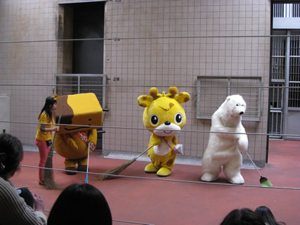●キリン舎屋内展示室で新しいキリンの入園を前にして、キリン・ウェルカムキャンペーンを行いました。ゆるキャラのいしきりん、くしたん、ゴーゴくんがキリン舎の掃除をしてくれました。