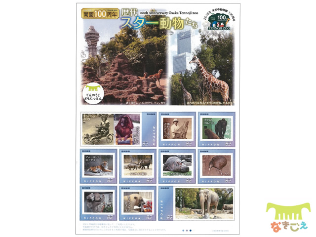 ●天王寺動物園開園100周年の記念フレーム切手「歴代スター動物たち」が大阪市内の郵便局で発売されました。