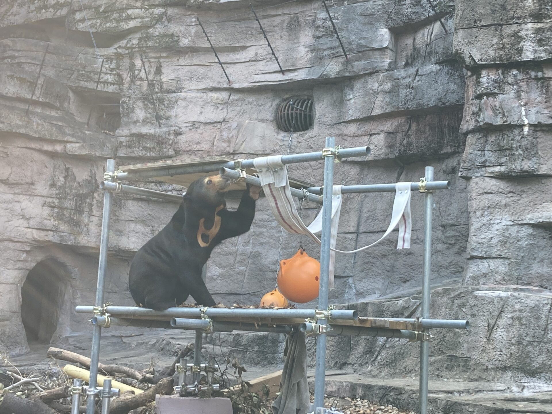 職員も対応を考えており、野生下のマレーグマは高い木に登るので、スペースの限られた展示場内に少しでも高さを出すため展示場に、単管パイプを使った「ヤグラ」を職員で協力し設置しました。また、Amazonほしい物リストでご寄附いただいたブイや消防ホースも設置しています。今後もエンリッチメント推進に尽力してまいります(2025年12月)。FooZoo内授乳室のご使用について